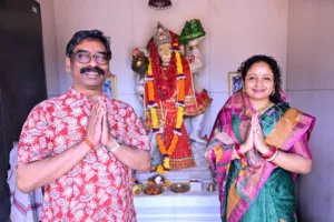 Ranchi, March 27: Chief Minister Hemant Soren, along with his wife and MLA Kalpana Soren, offered prayers on the occasion of Ram Navami at the Shri Ram Janaki Tapovan Temple in Nivaranpur, Ranchi.