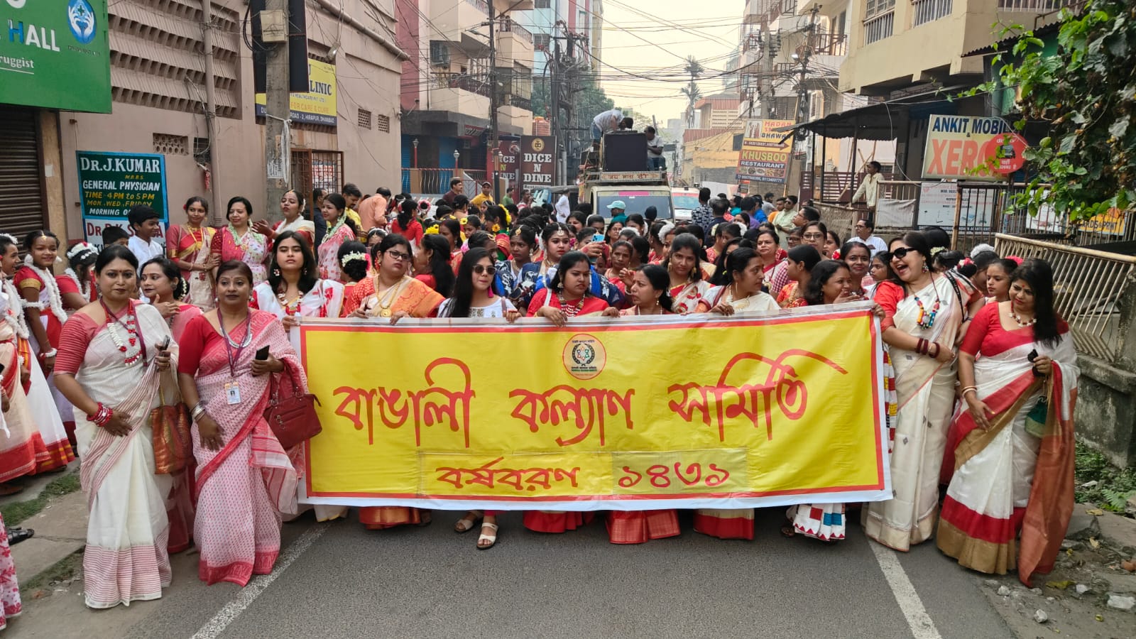The participants were clad in traditional white Saree with red border (women) and Bhadralok in Dhoti–Kurta, Pyjama