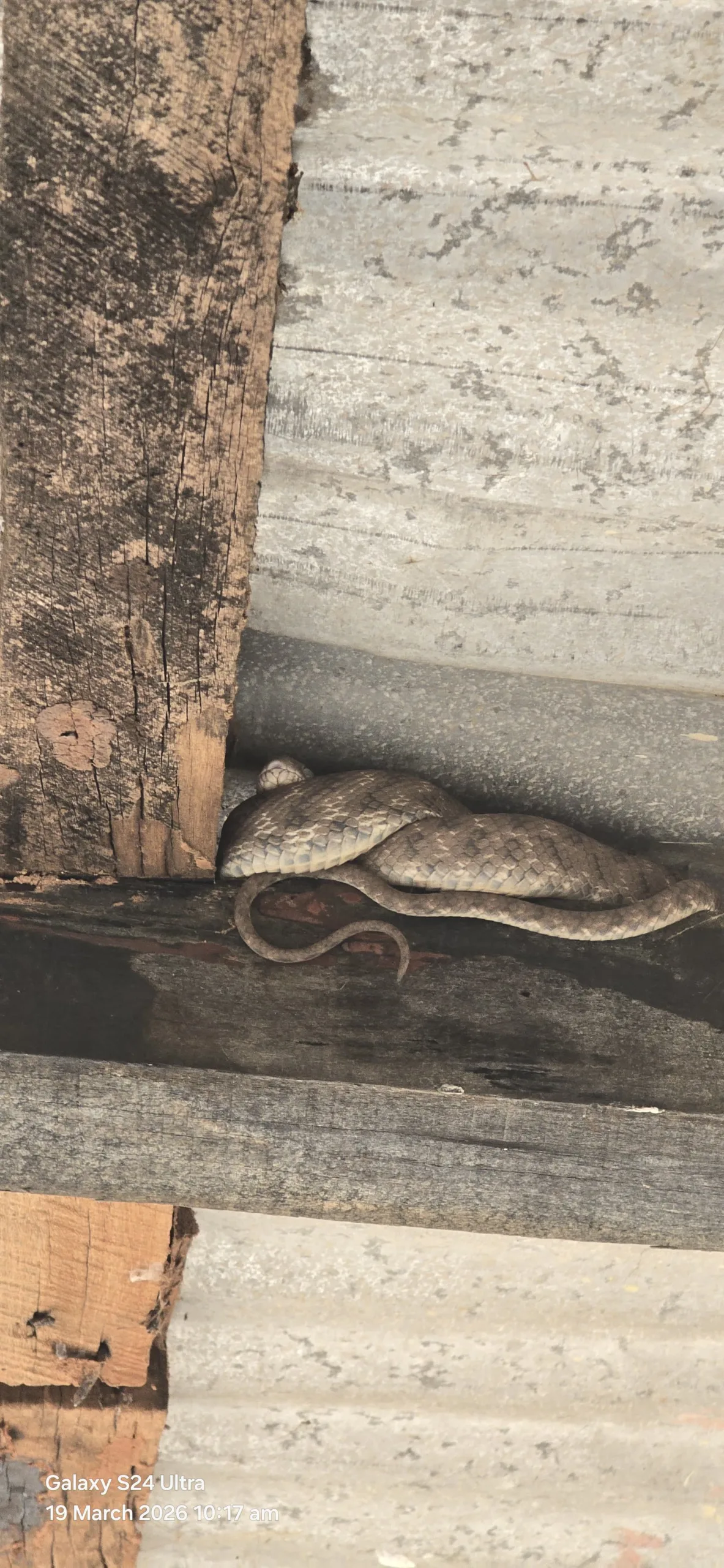 Despite efforts, the snake could not be rescued as it slipped deeper into a crevice within the verandah structure.